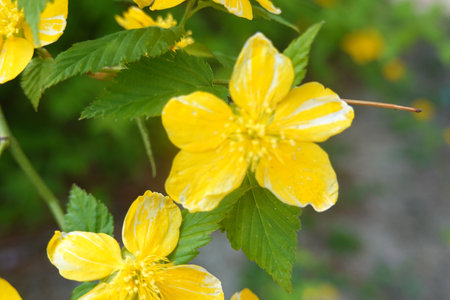 Spring yellow flowers on a green background. flowers of Double Flowered Japanese Rose, Kerria japonica,. High quality photo