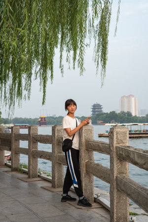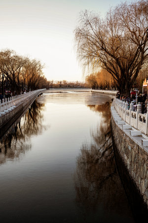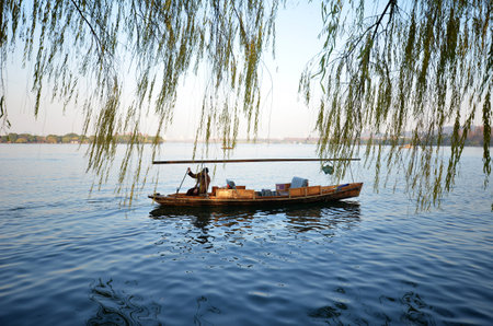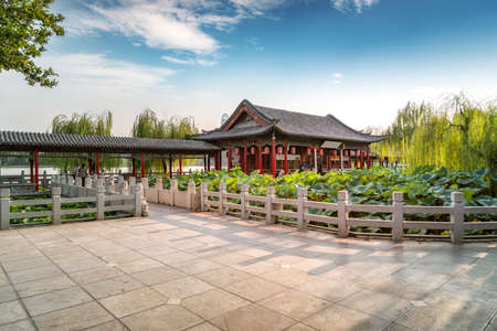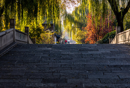 HANGZHOU, CHINA-JAN 14, 2018: Chinese park in Hangzhou near Xihu Lake China. Beautiful trees of willow along the river
