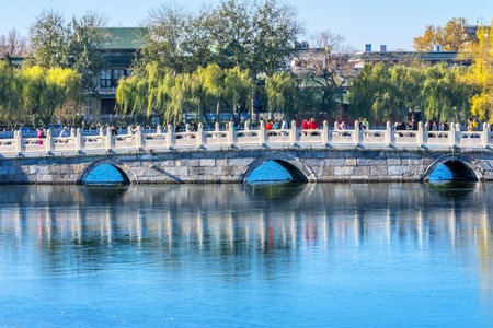 A shot of the stone bridge going over the lake Rear in Houhai, China