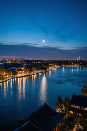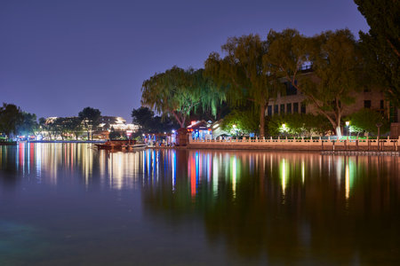 Night view of the Shichahai historic scenic area consisting of three lakes in central Beijing, China, on 21 April 2024