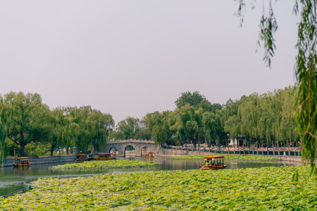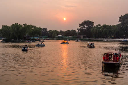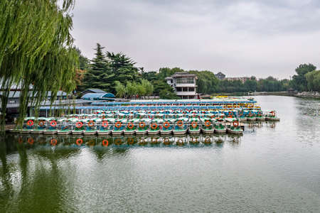 BEIJING, CHINA - AUGUST 26, 2018: Boats at Qianhai lake in Beijing, China