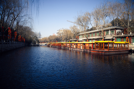 A famous travel area with Chinese traditional boats at the pier of Rear Lake in spring in Beijing, China