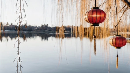 Chinese lanterns on the lake at winter time. Traditional Chinese lanterns.