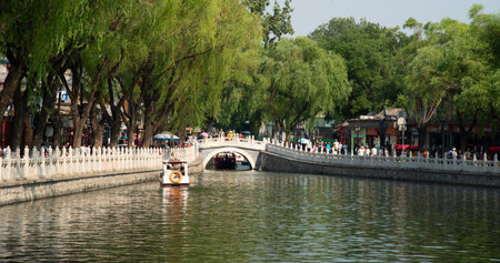 Beijing China, May 01, 2013 - People enjoy the boat trip at the Houhai lake channel in Beijing, China.