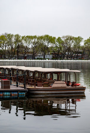 Beijing, China - June 2 2025 China traditional tourist boats on Beijing canals of Qianhai lake at ShiChaHai district . High quality photo