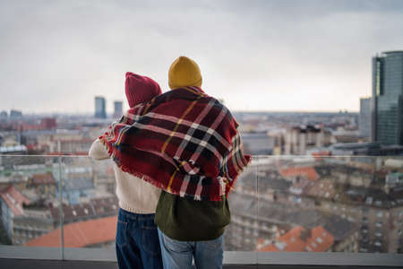 Rear view of young couple wrapped in blanket standing and hugging outdoors on balcony, looking at city view.