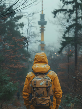 Traveler with backpack viewing Eiffel Tower on a foggy day, autumn colors in foreground.