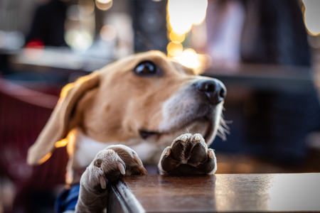 Portrit of american beagle dog sitting on the mat on the dog bed looking at aside. The sun shines from the window