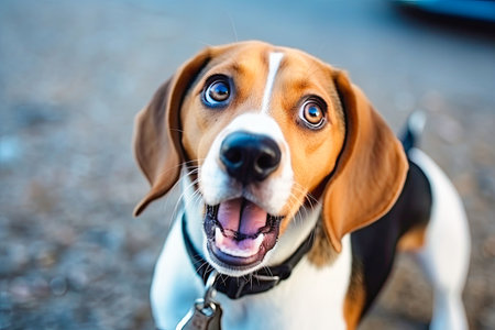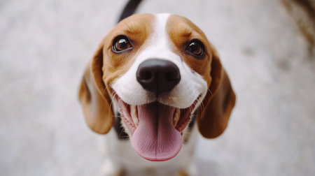 A beagle yawns widely showing its teeth and tongue, creating a humorous close-up perfect for adding funny text.