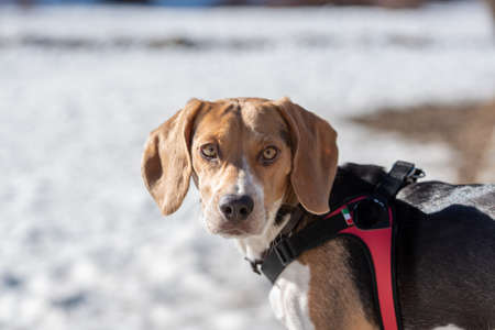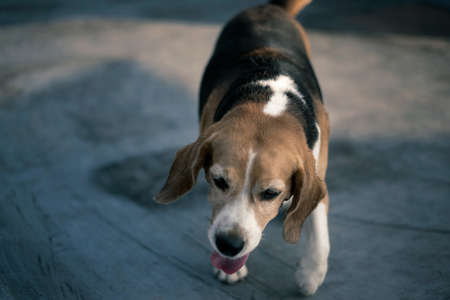 Beagle with tongue out in grass during sunset in fields countryside. Dog portrait back lit background. Animal dog concept.
