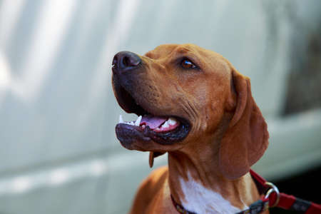 adorable rhodesian ridgeback dog portrait outdoors, looking up