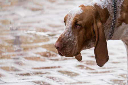 Portrait of a funny dog Pointer Kurzhaar. Brown background.