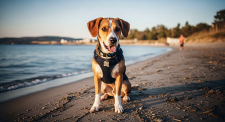 Close up of a mixed breed dog with attentive eyes and wet nose, enjoying a moment outdoors during a beautiful sunset, showcasing the beauty and curiosity of canine companions