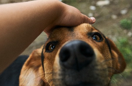 showing love and care to a dog by gently stroking its head, symbolizing the importance of proper animal treatment