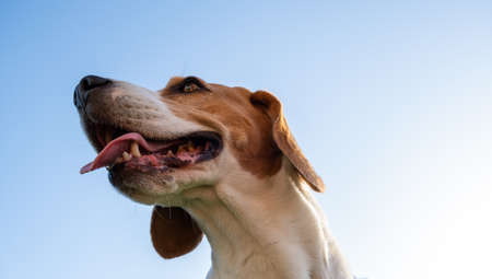 Closeup of Beagle dog head, 6 years old, looking away with tongue out in summer heat against blue sky
