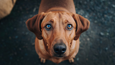 A brown Dachshund dog with intense blue eyes gazes upwards, its ears flopped down. The background is dark and textured.