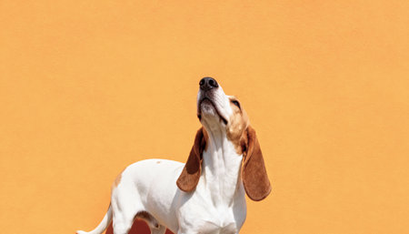 A charming Basset Hound with white and brown fur tilts its head back to howl or bark. The dog is isolated on a vibrant, solid orange studio background, creating a minimalist portrait.
