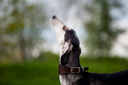 Borzoi, angry dog baring its teeth, studio lighting pastel background
