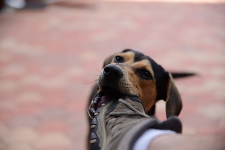 Shallow depth of field (selective focus) image with a young female stray dog, rescued and adopted.