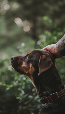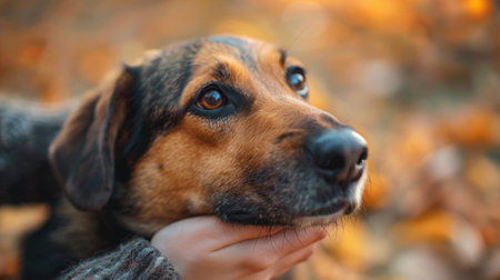 Close up of brown dog with persons hand on head, showing affection and love towards the loyal pet