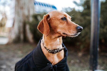 Lonely abandoned homeless hungry stray dog with grief face sitting on street in cold weared in jacked, beg for food