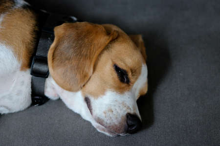 Beagle dog sleeping on sofa. Cute Beagle puppy on sofa indoors. Adorable pet. Beagle dog sleeping on sofa.