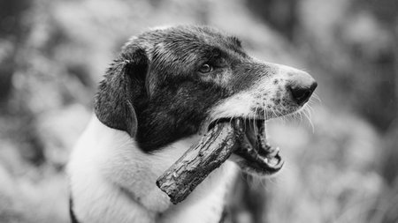 A greyscale shot of a stray dog biting a piece of wood with a blurred background