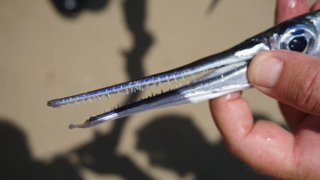 Wild needlefish washed up on sandy beach at high tide