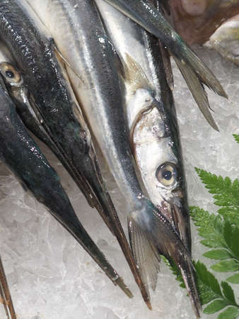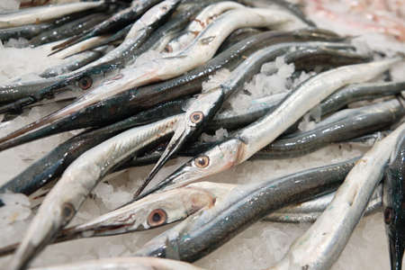Chilled needlefishes on ice at hypermarket freezer