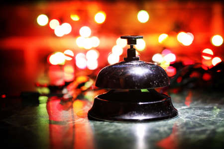 Red call bell or sevice bell ring put on the brown wooden desk with grey wall background.