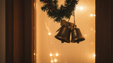 A beautiful brass bell dangles gracefully from a winter wreath, surrounded by lush greenery and bright red ornaments, creating a warm holiday welcome at the front door.