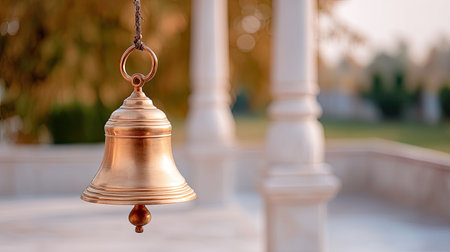A beautifully crafted golden bell suspended in a serene outdoor setting, featuring soft lighting and elegant architectural elements, ideal for evoking tranquility.