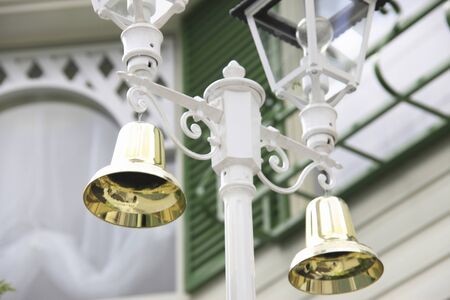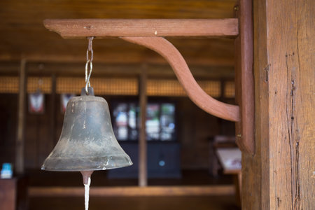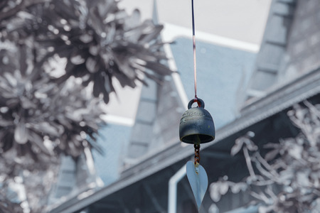 Little bell Thai style on blurry Thai style pavilion background. Vintage style.