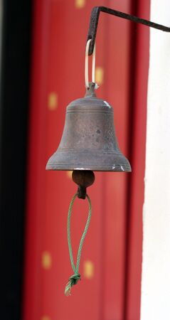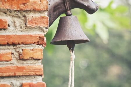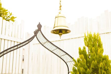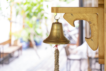 brass bell hand on to the wooden big plate stick on the pole wall.