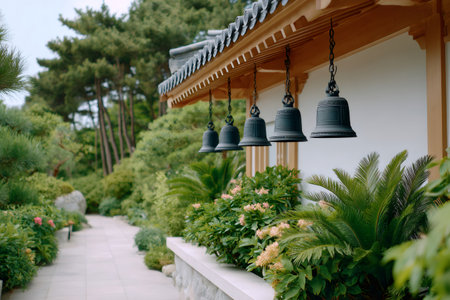 Korean traditional bells adorning a temple roof, surrounded by lush green garden foliage