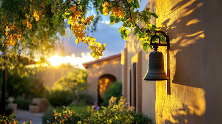 A charming bell hangs gracefully on a textured wall, adorned with vibrant yellow flowers as the sun sets, creating a warm and tranquil atmosphere.