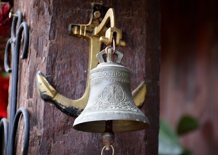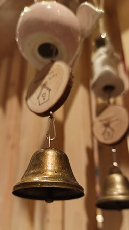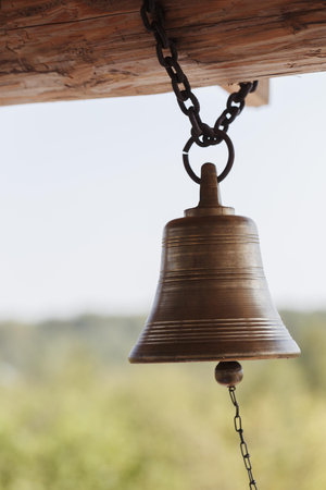 A close-up of a vintage brass bell hanging from a wooden frame, with intricate detailing and a rustic background, evoking a classic, nostalgic feel.