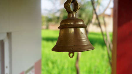 Selective focus on Temple ring with blurred background. Brass temple Ghanta or Bell for sound vibrations in Hindu temple.