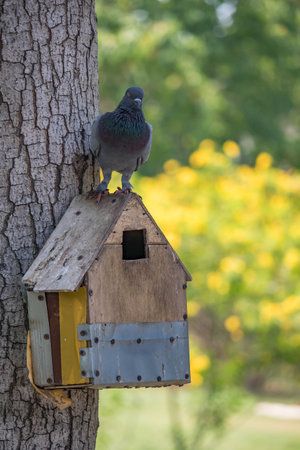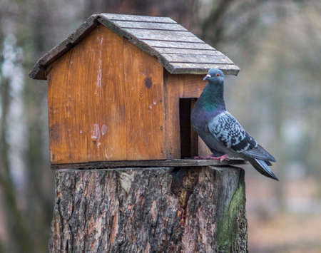 Park birdhouse, a lone pigeon sits on a makeshift bird feeder in the park on an autumn day. Pigeon waiting for food.