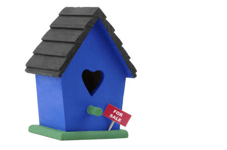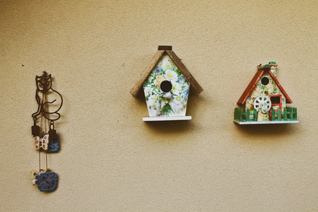 Bird's nest made of wood in the shape of a house hanging on a white wall