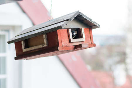 Titmouse bird looking outside from hanging small wooden traditional birdhouse