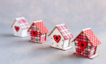 Close up of house models. Concept of building houses, residential settlements, choosing your own house, mortgage, buying and selling residential area, rental, insurance, and investment real estate.