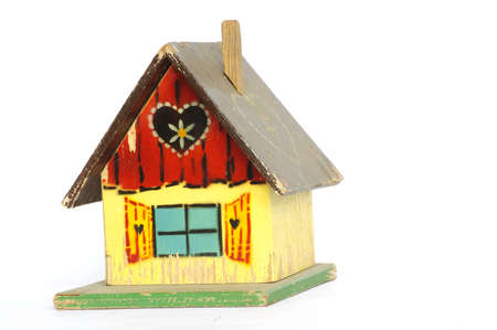 Colorful bird house on wooden background. Colorful wooden house on wooden background