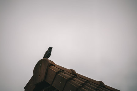 A flock of black crows flying and circling against the blue sky and roof of the house. Look up