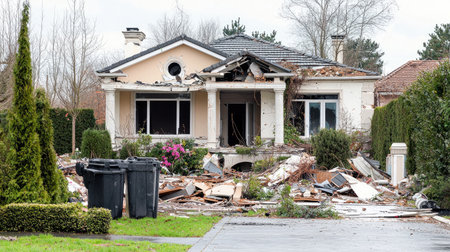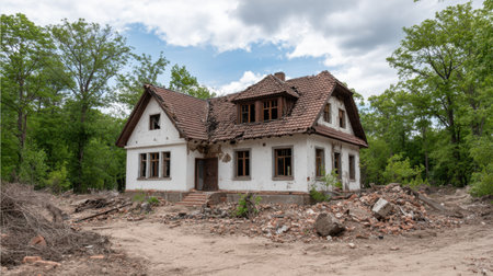 A haunting view of an abandoned residential structure with significant damage. Debris scattered in the yard reflects neglect, while overgrown foliage hints at forgotten memories.