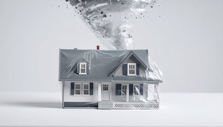 A miniature house is caught in the path of a swirling glitter tornado, symbolizing the fragility of property and investments in the face of natural disasters or financial turmoil. This conceptual image represents risk, the need for insurance, and the unpredictable nature of the housing market.