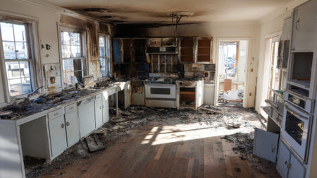 A kitchen shows severe fire damage with burned cabinets an oven and blackened walls. The sunlight highlights the destruction revealing debris scattered across the floor.