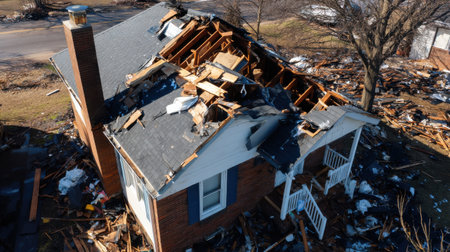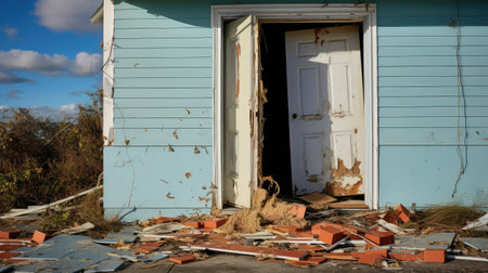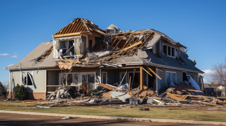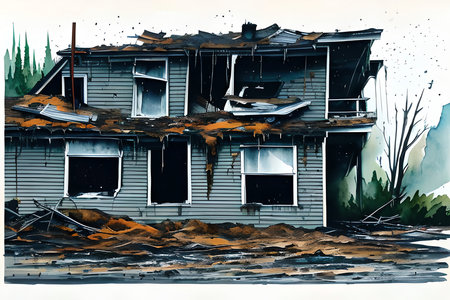 destruction wind damage to house illustration debris devastation, severe weather, rubble demolished destruction wind damage to house