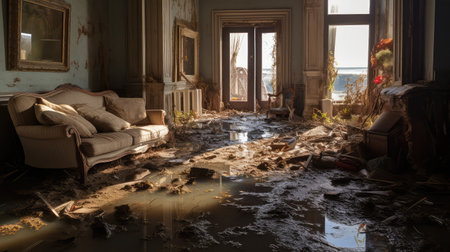 The image captures the aftermath of a severe weather event showing extensive damage to a house's interior, with debris spread across the floor and visible structural integrity issues.