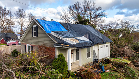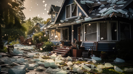 The image shows a damaged residential property after a severe storm, featuring debris and a broken structure, emphasizing the impact on the neighborhood.